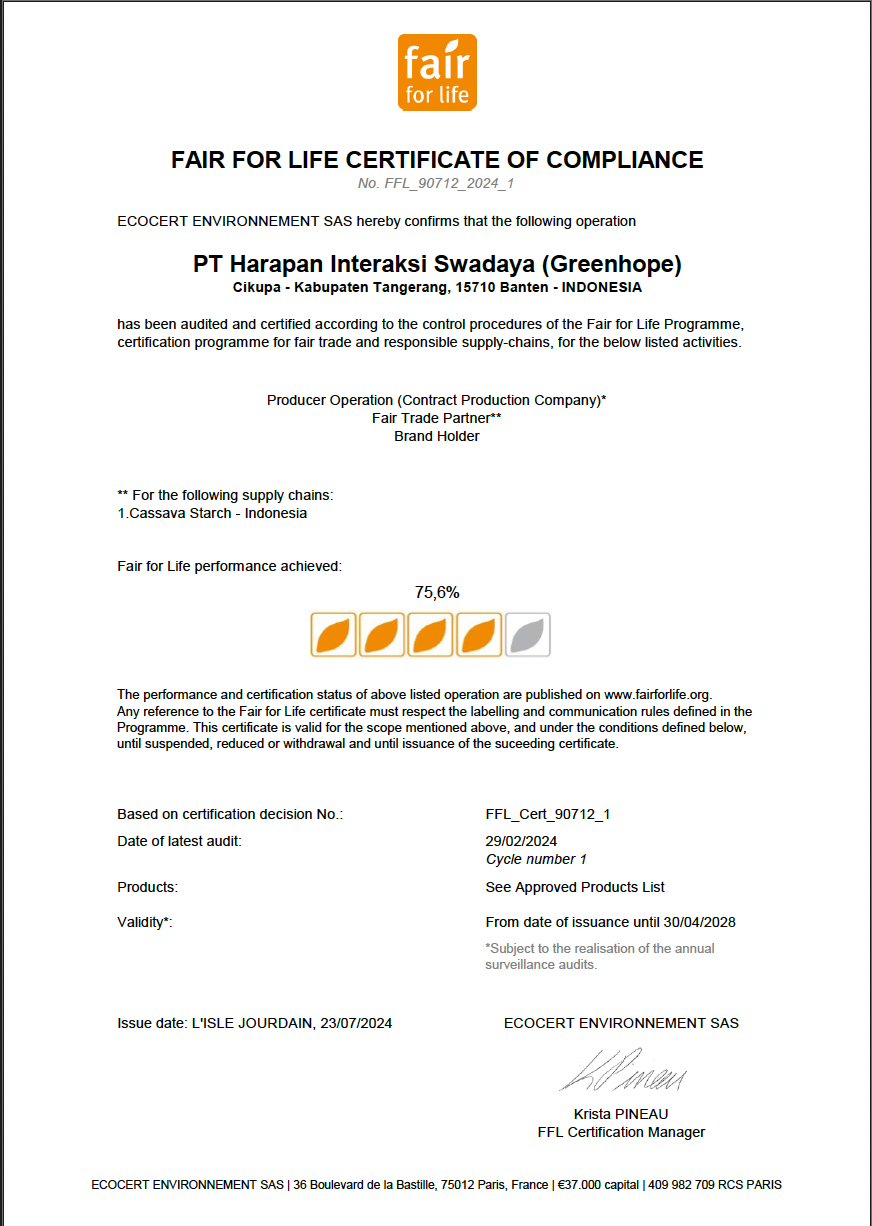 After undergoing a thorough audit process at the end of February 2024, PT Harapan Aktif Swadaya (Greenhope) officially received the latest Fair for Life (FFL) certificate in March 2024. In this certification, Greenhope scored 75.6% and received four out of five leaves, a proud achievement and an improvement compared to the previous certification results.