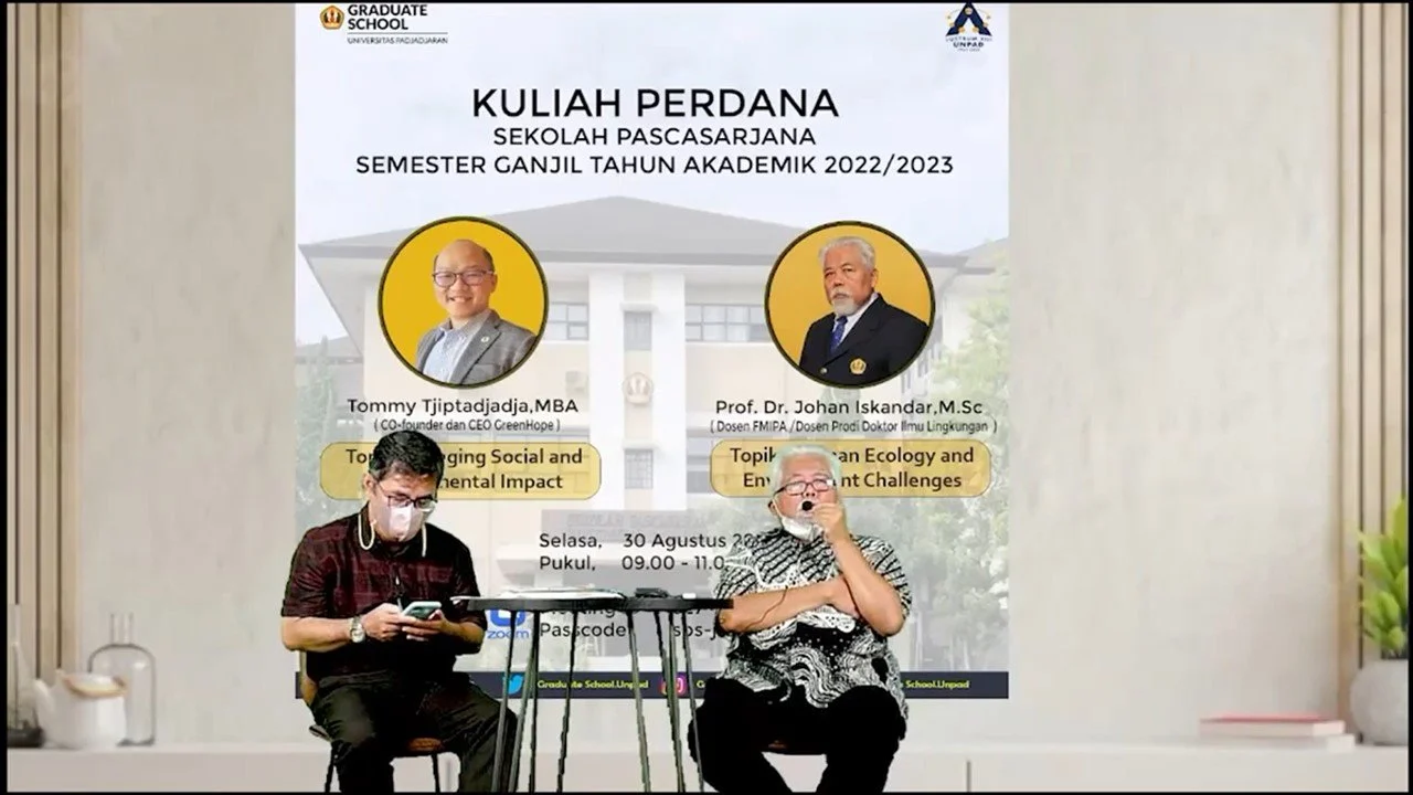 On Tuesday, 30 August 2022, the inaugural lecture of the New Graduate School Odd Semester Academic Year 2022/2022 was held with two main speakers, Prof. Dr. Johan Iskandar, M.Sc., Ph.D as a professor of Padjajaran University and Olivia Dianina Purba as Senior Manager of Partnership, Sustainability and Impact at Greenhope. The inaugural lecture, which was held online, was a series of new student admission activities aimed at opening environmentally conscious thinking and encouraging ideas for solutions to efforts to create a sustainable environment.